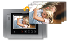 | Connection of wireless phone (Frequency: 1.7GHz) Possibility to have telephone conversation with a visitor from anywhere in the appartment (CAV-707MTM). | Saving of visitor's imagePossibility to record and save visitor's image in case of enabling the 'Away' mode (128 cuts/second) | ||